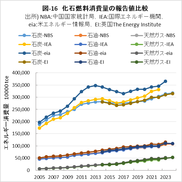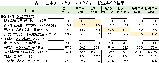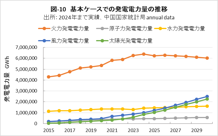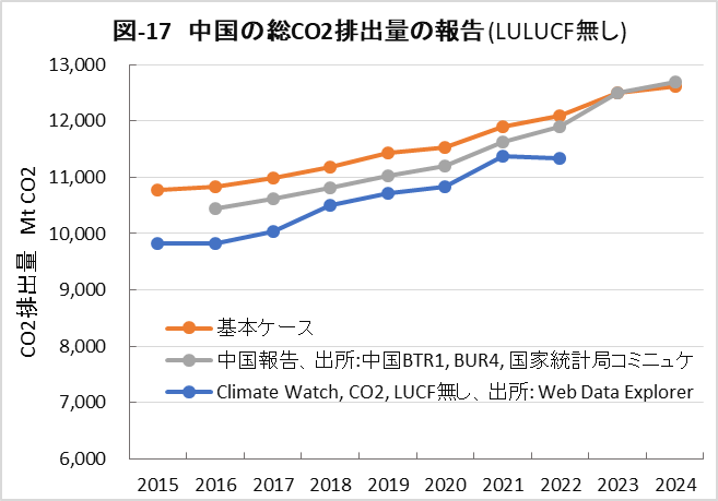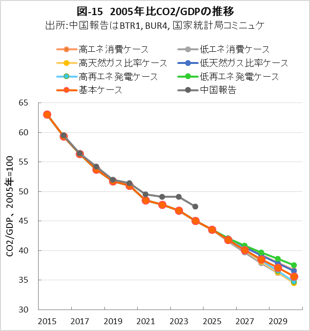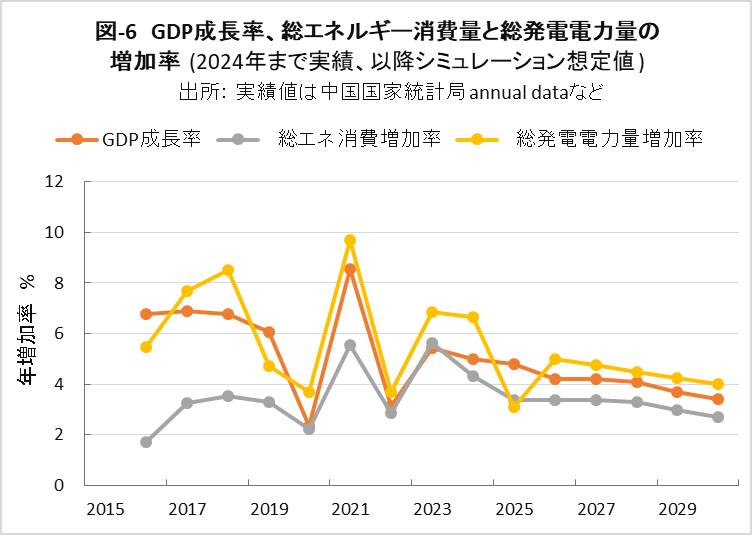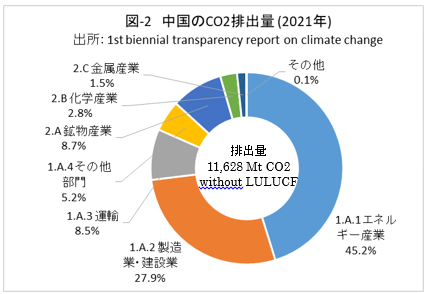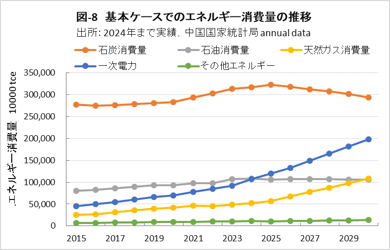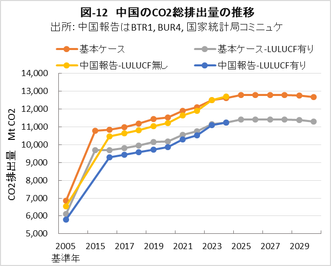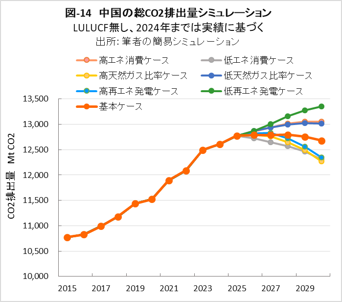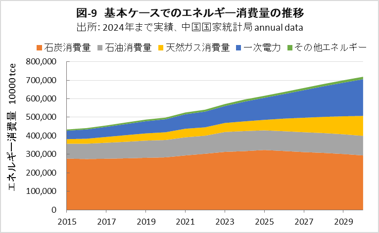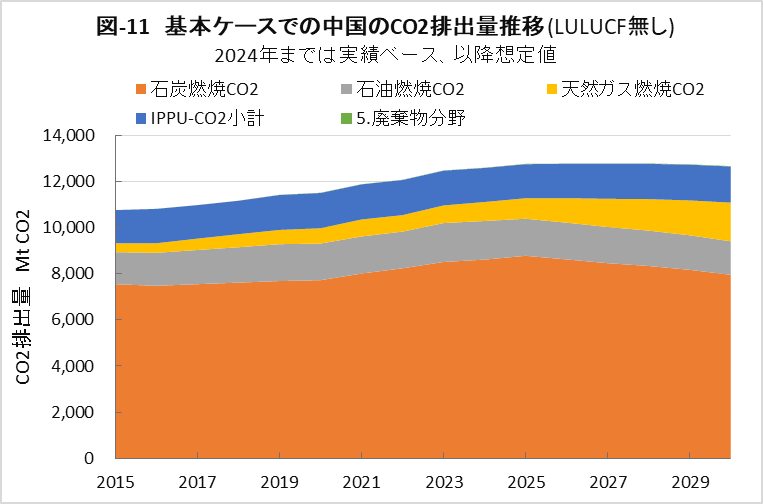 | <要旨> 先進国と異なり4~5%の経済成長を続ける中国は、必然的にエネルギー消費量が増加します。CO2排出量を減少に転じるには、エネルギー消費の増加を帳消しにするCO2削減策の実施が必要になります。 1年だけCO2排出量を減少させることは、それほど難しくありません。しかし、継続的に減少させるには、毎年CO2削減策の追加を続ける必要があります。エネルギー消費の増加と、継続的なCO2排出減少の両立は思いの外難しい問題です。 2030年までに効果的なCO2削減策は、風力と太陽光発電の導入拡大と、石炭から天然ガスへの燃料転換です。本稿は、それらをどれだけ行えば、2030年のCO2削減目標を達成ができるかを簡易化シミュレーションで検討したものです。 シミュレーションは上記の考えに従い、次のように行いました。詳しくは、本文に示しています。 2030年までの経済成長による総エネルギー消費量の増加を想定します。また、中国の石油消費の増減は僅かであり変化量を想定します。それら想定を基に、非化石燃料発電と天然ガスをどれだけ増やせば、CO2削減目標が達成できるか検討しました。なお、最大のCO2排出源である石炭消費量は従属変数として決まります。 2030年までにCO2排出量を減少に転じることは可能ですが、困難が伴うのは、GDP当たりのCO2排出量(Carbon Intensity)を2005年レベルから65%以上削減する目標の達成です。 2021年更新のNDC(気候変動に関して国が決定する貢献)の提出以後、総エネルギー消費量が想定以上に増大したためです。 総エネルギー消費量が平均年率3.2%増加する基本ケースで、目標を達成するには2024年実績に比べ、2030年の風力と太陽光発電の合計電力量を2.5倍前後、天然ガス消費量を2倍前後に増やすことが必要になります。 風力と太陽光発電合計の総電力量比率は40%近くになり、送電網増強に多額の設備投資と、電力の安定供給のために系統運用の高度化が必要になります。 また、現状中国は天然ガス消費の約40%を輸入に依存しており、増加分の大半は輸入量の増加になります。中国にとって輸入額の負担増、世界にとって天然ガス需給のひっ迫が予測されます。 <温暖化に係わる主な目標> 表-1に、パリ協定に関して中国が2021年に提出した更新NDCを示しました。2030年までにCO2排出量をピークにするとともに、GDP当りCO2排出量を2005年レベルから65%以上削減する目標としています。 ![]() <GHGとCO2の排出実績> 中国の温室効果ガス(GHG)やCO2の排出概要を示すため、2021年の内訳を図-1、図-2に示しました。パリ協定に基づき中国が提出した ”First Biennial Transparency Report on Climate Change (December 2024)” に記載されたデータです。 図-1のGHGはCO2、CH4、N2O、F-ガスの内訳を示しており、排出量はCO2相当量(CO2eq)の比率で、土地利用・土地利用変化及び林業分野 (LULUCF)の排出量を含まない値です。CO2排出量は、GHG排出量の81%を占めています。 LULUCF分野の排出量はマイナス1,315 MtCO2eq(吸収量)で、ほとんどがCO2によるものです。 ![]() 図-2にはCO2排出量を少し詳しい分類で示しました。同図の排出源名の頭についている1.A.1などは、国連気候変動枠組条約(UNFCCC)のGHG排出量報告で定められている番号で、1.A.1~1.A.4は1.A 燃料の燃焼、2.A~2.Cは2.工業プロセス及び製品の使用分野(IPPU)の排出量です。 燃料燃焼CO2が、CO2排出量全体の87%を占めています。 ![]() 図-3は、図-2に示したIPPU分野について、産業部門の代わりに、排出量の多い具体的な製品プロセスを示したものです。セメント製造プロセスがCO2総排出量の6.9%、石灰製造の1.6%、石油化学の1.4%、アンモニア製造の1.2%などが排出量の多いプロセスです。 ![]() 化石燃料を燃料として使用して排出されるCO2は、燃料燃焼CO2に分類されています。一方、セメントや石灰の生産プロセスのように石灰石由来のCO2や、プラスチック製造などの原料として使用される化石燃料から排出されるCO2は、IPPU分野のCO2に分類されています。 図-4に、中国が公的に報告しているGHGとCO2の排出量の推移を、LULUCF考慮の有無両者について示しました。なお、2005年は中国のGHG排出削減の基準年です。2005年に対する2021年の排出量の増加率は、LULUCFの有無に係わらずGHGは約1.7倍、CO2は約1.8倍です。 ![]() 図-4で2010年代半ばに、排出量の増加率が低い期間が見られます。これは石炭使用による深刻な大気汚染の対策として、中小設備を中心に石炭利用を規制したことで、CO2排出量の増加が抑制されたものです。 <エネルギー消費量の実績> 中国のCO2排出量が増加するのは、経済成長によりエネルギー消費が増加するためです。図-5に総エネルギー消費量の実績を示しました。中国国家統計局(NBS)が公表しているデータです。本稿では、できるだけ中国の公的機関が公表しているデータを使用しました。 ![]() 中国の総エネルギー消費量は、国際エネルギー機関(IEA)の総エネルギー供給量(TES)に相当するデータです。中国の総エネルギー消費量は、石炭、石油、天然ガス、一次電力とその他エネルギー、の4分類で示されています。 