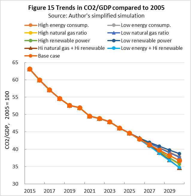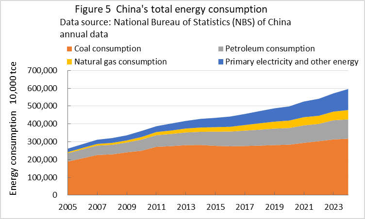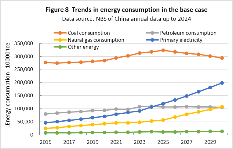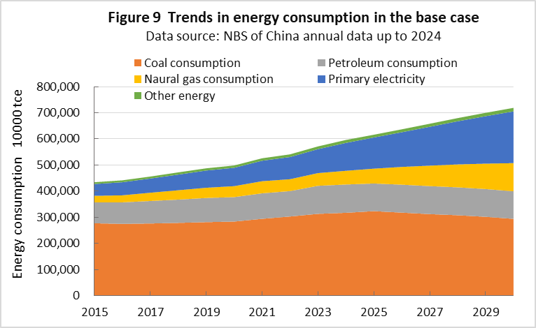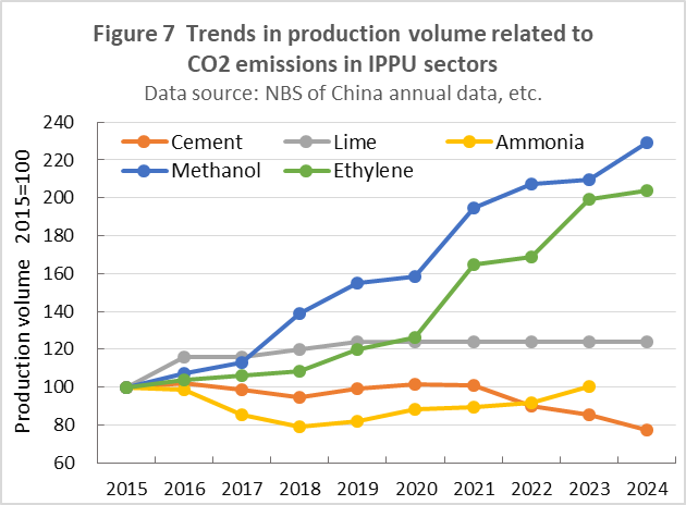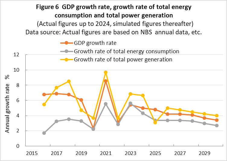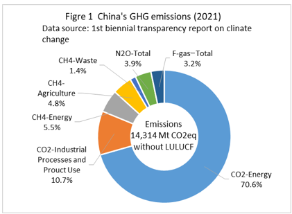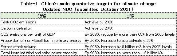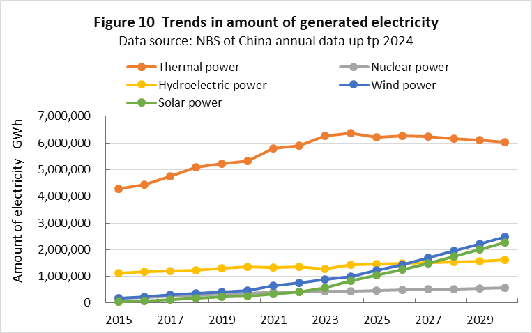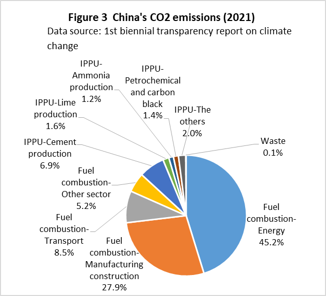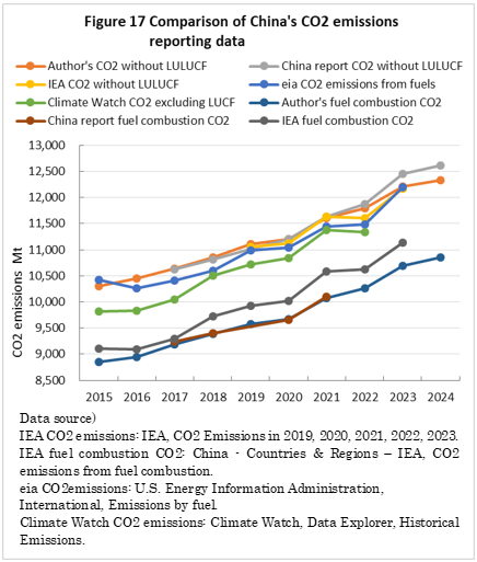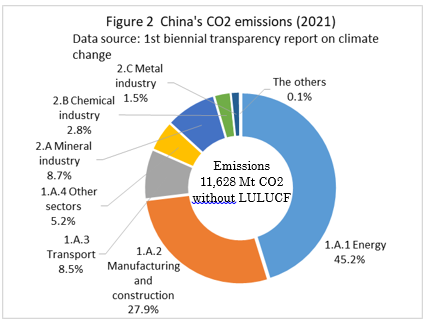 | top > global warming > China CO2 China's 2030 CO2 reduction target difficult to achieve, By: Yuzo Tanaka, Japanese Researcher Published November 8, 2025 Revised January 13, 2026 ![]() Summary Unlike developed countries, China's economic growth rate of 4-5% inevitably leads to increased energy consumption. To reduce CO2 emissions, it is necessary to implement CO2 reduction measures that offset the increase in energy consumption. Effective CO2 reduction measures by 2030 include expanding the use of renewable energy and switching from coal to natural gas. The former reduces fossil fuel consumption, while the latter leads to low-carbon energy consumption. To sustainably reduce CO2 emissions while increasing energy consumption, it is necessary to continually add new CO2 reduction measures each year to offset the increase in energy consumption. Achieving a sustainable reduction in CO2 emissions while simultaneously increasing energy consumption is more difficult than you might think. Nevertheless, peaking CO2 emissions by 2030 is a goal announced by President Xi Jinping, and therefore likely to be achieved. What is challenging is achieving the target for CO2 emissions per GDP (carbon intensity). China's 2021 updated NDC (Nationally Determined Contribution to Climate Change) states that it will reduce CO2 emissions per GDP by more than 65% from 2005 levels by 2030. This goal has become more difficult to achieve due to a larger-than-expected increase in energy consumption since the updated NDC was submitted. This paper uses a simplified simulation to examine the achievement of CO2 reduction targets by 2030. The simulation assumed future GDP growth rates and total energy consumption, and calculated CO2 emissions under conditions of increased non-fossil fuel power generation and natural gas consumption. Details are provided in the main text. According to the simulation, achieving the 2030 target will require a roughly 2.7-fold increase in the total amount of electricity generated by wind and solar power, as well as natural gas consumption, in 2030 compared to 2024 levels. Wind and solar power, whose output fluctuates depending on the weather, will account for around 40% of total electricity generation. This will require significant investment in strengthening the power transmission network by 2030, and advanced grid operation will be required to ensure a stable power supply. Furthermore, China currently relies on imports for approximately 40% of its natural gas consumption, and most of the increase will be due to increased imports. This is expected to increase China's import costs and tighten the global natural gas supply and demand situation. Main targets for climate change Table 1 shows China's updated NDC, submitted in 2021, for the Paris Agreement. It aims to peak CO2 emissions by 2030 and reduce CO2 emissions per GDP by more than 65% from 2005 levels. ![]() GHG and CO2 emissions To provide an overview of China's greenhouse gas (GHG) and CO2 emissions, Figures 1 and 2 show the breakdown for 2021. This data is from China's "First Biennial Transparency Report on Climate Change (December 2024)" submitted under the Paris Agreement. GHG in Figure 1 shows the breakdown of CO2, CH4, N2O, and F-gases. Emissions are expressed as the percentage of CO2 equivalents (CO2eq), excluding emissions from the land use, land-use change, and forestry (LULUCF) sector. CO2 emissions account for 81% of GHG emissions. Emissions from the LULUCF sector were minus 1,315 MtCO2eq (removals), mostly due to CO2. ![]() Figure 2 shows a more detailed breakdown of CO2 emissions. The numbers at the beginning of the emission source names in the figure, such as 1.A.1, are numbers specified in the GHG emissions reporting standards of the United Nations Framework Convention on Climate Change (UNFCCC), with 1.A.1 to 1.A.4 representing 1.A fuel combustion emissions, and 2.A to 2.C representing 2. industrial process and product use (IPPU) emissions. CO2 from fuel combustion accounts for 87% of total CO2 emissions. ![]() Figure 3 shows the specific product processes with high emissions instead of the industrial sector for the IPPU sector shown in Figure 2. The cement process accounts for 6.9% of total CO2 emissions, followed by lime process at 1.6%, petrochemical process at 1.4%, and ammonia process at 1.2%. ![]() CO2 emitted from using fossil fuels as fuel is classified as fuel combustion CO2. On the other hand, CO2 derived from limestone, such as in the cement and lime production processes, and CO2 emitted from fossil fuels used as raw materials in plastics production, are classified as IPPU CO2. Figure 4 shows the trends in China's reported GHG and CO2 emissions, both with and without consideration of LULUCF. Note that 2005 is the base year for China's GHG emission reductions. The rate of increase in emissions from 2005 to 2021 is approximately 1.7 times for GHGs and approximately 1.8 times for CO2, regardless of whether LULUCF is implemented. ![]() Figure 4 shows that emissions growth was slow in the mid-2010s. This is due to restrictions on coal use, particularly in small and medium-sized facilities, which were implemented as a measure to combat serious air pollution caused by coal use, thereby curbing the increase in CO2 emissions. Energy consumption data China's CO2 emissions are increasing due to increased energy consumption resulting from economic growth. Figure 5 shows the total energy consumption data reported by the National Bureau of Statistics (NBS) of China. This article uses data reported by Chinese official institutions whenever possible. ![]() China's total energy consumption is equivalent to the International Energy Agency's (IEA) total energy supply (TES). China's total energy consumption is broken down into four categories: coal, petroleum, natural gas, and primary electricity and other energy. The energy unit generally used is the standard ton of coal equivalent (tce), which is converted at 1 tce = 7 Gcal. Note t