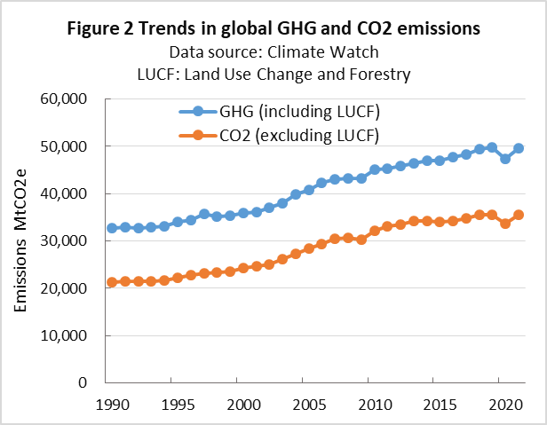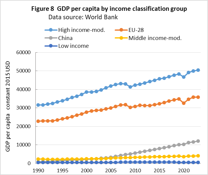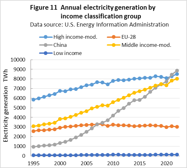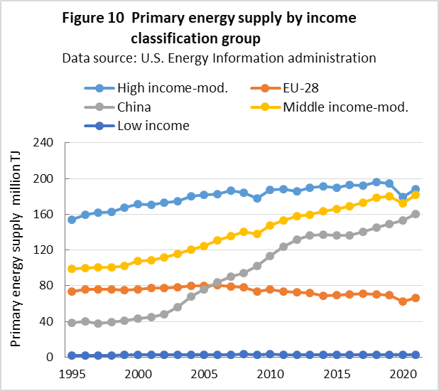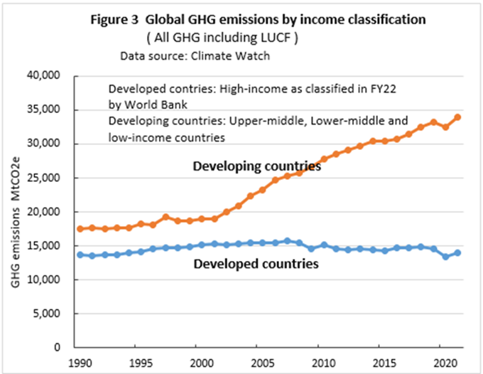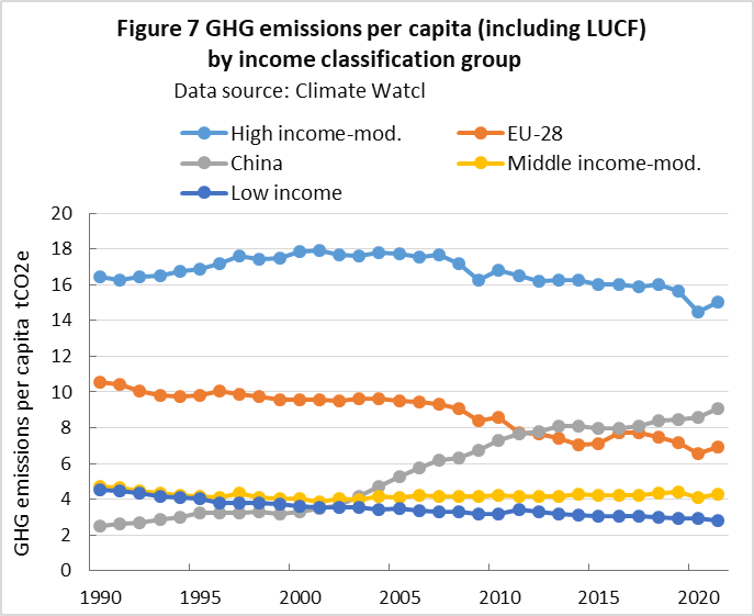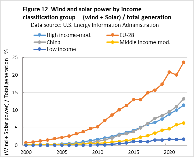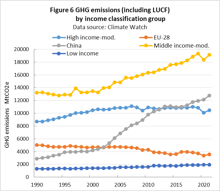 | top > global warming > global ghg Why are global GHG emissions increasing? It’s no surprise! By: Yuzo Tanaka, Japanese Researcher January 13, 2025 It was reported by the media during COP29 that global CO2 emissions from fossil fuels reached a record high in 2024 and there is still “no sign” that the world has reached a peak, according to new research by the Global Carbon Project – one of the contributors to WMO's United in Science reports. Why are global greenhouse gases increasing? The following explains why. Introduction There is a great deal of interest in global warming. Figure 1 uses data from Berkeley Earth.The Paris Agreement aims to limit the rise in global average temperature to less than 2℃, aiming for 1.5℃, but it is certain that it will exceed 1.5℃ in the 2030s. ![]() Figure 2 uses data downloaded from Climate Watch's Data Explorer. 9 years have passed since the adoption of the Paris Agreement, but global greenhouse gas (GHG) emissions continue to increase. ![]() While GHG emissions in developed countries are decreasing, emissions in developing countries, which account for about two-thirds of global GHG emissions, continue to increase. The target cannot be achieved if only developed countries reduce their emissions. ![]() Classification of countries around the world by income level This report classifies countries around the world into groups based on income level, and shows GHG emissions and their reduction status in relation to wealth. As shown in Table 1, the classification of each country is based on the World Bank's four-level classification by GNI per capita for FY22. ![]() According to the World Bank's classification, the EU-28 countries, including the UK, which has a large impact on reducing GHG emissions, are classified as High income countries except for Bulgaria, and China is classified as an Upper-middle income country. In this report, High income countries excluding the EU-28 countries are named "High income-mod.", and the combined group of Upper-middle income countries and Lower-middle income countries excluding China is named "Middle income-mod.". The GHG emissions, GDP, etc. of about 200 countries and regions around the world were compiled, divided into five groups. The most significant drivers of GHG emissions growth are middle-income countries, including China, which accounts for three-quarters of the world's population but less than 40% of its GDP in 2022. ![]() ![]() Middle-income country emissions As shown in Figure 6, GHG emissions from the EU-28 have continued to decline, and High income-mod. have also started to decline in recent years. Meanwhile, Middle income-mod. and China, in addition to having large GHG emissions, have continued to increase significantly. Low income countries have also increased, but their emissions are low. ![]() It is natural that large countries with large populations have large GHG emissions. GHG emissions per capita is an easy-to-understand indicator for comparing the amount of GHG emissions of each country and evaluating the lack of reduction efforts. Figure 7 shows the trends in per capita GHG emissions for each group. ![]() In recent years, the per capita GHG emissions of Middle income-mod. have been less than one-third of those of High income-mod.. Even compared to the EU-28, where GHG emissions reductions have been progressing, the figure is only about 60% lower. It is not surprising that Middle income-mod. are not proactive in reducing GHG emissions, which entails economic burdens. Figure 8 shows the trend of real GDP per capita. In recent years, the value of Middle income-mod. has been extremely low, less than one-tenth of that of High income-mod., and 12% of that of the EU-28. It is natural for Middle income-mod. to aim for economic growth. However, economic growth increases energy consumption and GHG emissions. ![]() Figure 9 shows the trends in GDP growth rates for each group. This was calculated from the annual change in real GDP. Because the fluctuations are large and difficult to understand, a three-period moving average is also shown. ![]() Growth rates in recent years have fluctuated due to the COVID-19 pandemic, but while High income-mod. and the EU-28 have grown at less than 2%, Middle income-mod. have remained at around 3% or higher. The concept of green growth was proposed around 2010, but it has since been pointed out that it is only work with low growth. Another reason for the decline in GHG emissions in developed countries in recent years is that manufacturing has been shifting from developed to developing countries. Figure 10, using international data from the U.S. Energy Information Administration shows trends in primary energy supply for each group. ![]() In recent years, primary energy supplies in the EU-28 have been declining slowly, with High income-mod. remaining roughly stable, while China and Middle income-mod. have increased substantially. As with primary energy supply in Figure 10, electricity demand in the EU-28 is gradually decreasing, while electricity demand in High income-mod. is almost flat. In contrast, electricity demand in China and Middle income-mod. is increasing significantly. ![]() Such trends in electricity demand affect the expansion of wind and solar power generation. Since high income countries do not have an increase in electricity demand, they only need to introduce and expand wind and solar power generation to reduce CO2 emissions. In contrast, middle income countries are required to meet the electricity demand and reduce CO2 emissions. A stable supply of cheap electricity is essential for economic growth. As a result, middle-income countries, which are striving for economic growth but lack funds for capital investment, will respond to increased electricity demand by expanding traditional power generation such as fossil fuel power plants, and will gradually introduce wind and solar power within their surplus capacity. As shown in Figure 12, the EU-28, which 