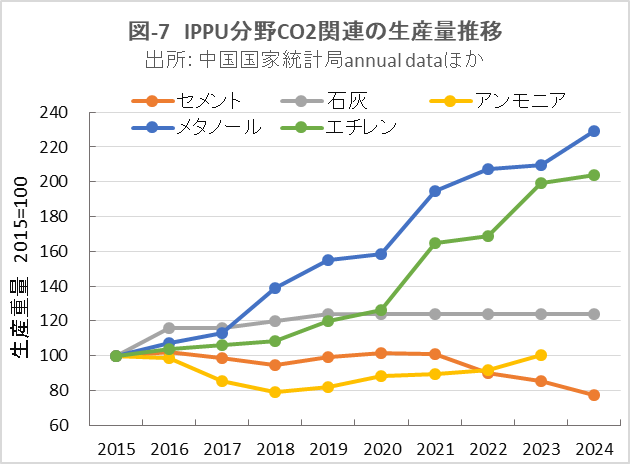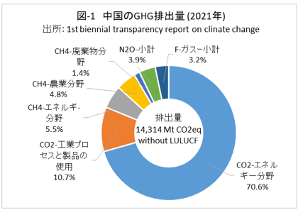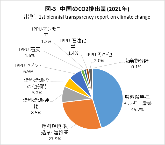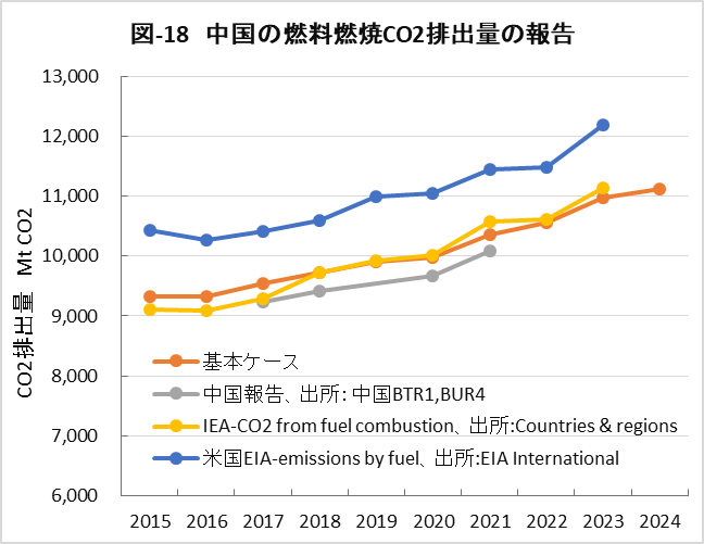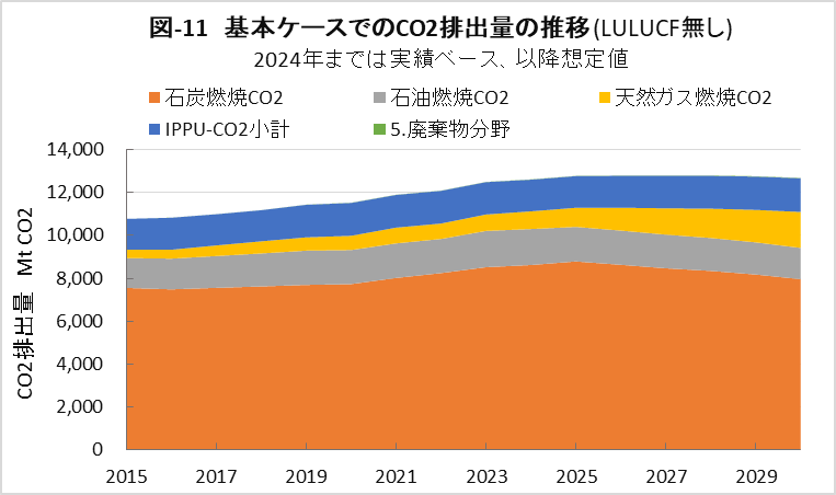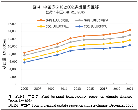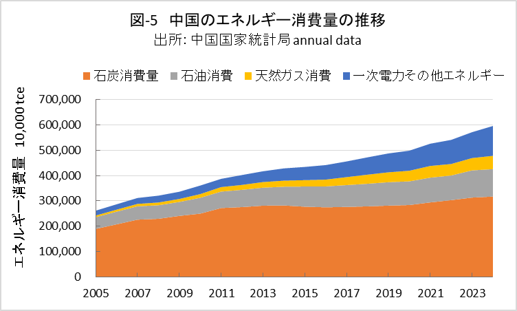 | <要旨> 先進国と異なり4~5%の経済成長を続ける中国は、必然的にエネルギー消費量が増加します。CO2排出量を減少に転じるには、エネルギー消費の増加を帳消しにするCO2削減策の実施が必要になります。 1年だけCO2排出量を減少させることは、それほど難しくありません。しかし、継続的に減少させるには、毎年CO2削減策の追加を続ける必要があります。エネルギー消費の増加と、継続的なCO2排出減少の両立は思いの外難しい問題です。 2030年までに効果的なCO2削減策は、風力と太陽光発電の導入拡大と、石炭から天然ガスへの燃料転換です。本稿は、それらをどれだけ行えば、2030年のCO2削減目標を達成ができるかを簡易化シミュレーションで検討したものです。 シミュレーションは上記の考えに従い、次のように行いました。詳しくは、本文に示しています。 2030年までの経済成長による総エネルギー消費量の増加を想定します。また、中国の石油消費の増減は僅かであり変化量を想定します。それら想定を基に、非化石燃料発電と天然ガスをどれだけ増やせば、CO2削減目標が達成できるか検討しました。なお、最大のCO2排出源である石炭消費量は従属変数として決まります。 2030年までにCO2排出量を減少に転じることは可能ですが、困難が伴うのは、GDP当たりのCO2排出量(Carbon Intensity)を2005年レベルから65%以上削減する目標の達成です。 2021年更新のNDC(気候変動に関して国が決定する貢献)の提出以後、総エネルギー消費量が想定以上に増大したためです。 総エネルギー消費量が平均年率3.2%増加する基本ケースで、目標を達成するには2024年実績に比べ、2030年の風力と太陽光発電の合計電力量を2.5倍前後、天然ガス消費量を2倍前後に増やすことが必要になります。 風力と太陽光発電合計の総電力量比率は40%近くになり、送電網増強に多額の設備投資と、電力の安定供給のために系統運用の高度化が必要になります。 また、現状中国は天然ガス消費の約40%を輸入に依存しており、増加分の大半は輸入量の増加になります。中国にとって輸入額の負担増、世界にとって天然ガス需給のひっ迫が予測されます。 <温暖化に係わる主な目標> 表-1に、パリ協定に関して中国が2021年に提出した更新NDCを示しました。2030年までにCO2排出量をピークにするとともに、GDP当りCO2排出量を2005年レベルから65%以上削減する目標としています。 ![]() <GHGとCO2の排出実績> 中国の温室効果ガス(GHG)やCO2の排出概要を示すため、2021年の内訳を図-1、図-2に示しました。パリ協定に基づき中国が提出した ”First Biennial Transparency Report on Climate Change (December 2024)” に記載されたデータです。 図-1のGHGはCO2、CH4、N2O、F-ガスの内訳を示しており、排出量はCO2相当量(CO2eq)の比率で、土地利用・土地利用変化及び林業分野 (LULUCF)の排出量を含まない値です。CO2排出量は、GHG排出量の81%を占めています。 LULUCF分野の排出量はマイナス1,315 MtCO2eq(吸収量)で、ほとんどがCO2によるものです。 ![]() 図-2にはCO2排出量を少し詳しい分類で示しました。同図の排出源名の頭についている1.A.1などは、国連気候変動枠組条約(UNFCCC)のGHG排出量報告で定められている番号で、1.A.1~1.A.4は1.A 燃料の燃焼、2.A~2.Cは2.工業プロセス及び製品の使用分野(IPPU)の排出量です。 燃料燃焼CO2が、CO2排出量全体の87%を占めています。 ![]() 図-3は、図-2に示したIPPU分野について、産業部門の代わりに、排出量の多い具体的な製品プロセスを示したものです。セメント製造プロセスがCO2総排出量の6.9%、石灰製造の1.6%、石油化学の1.4%、アンモニア製造の1.2%などが排出量の多いプロセスです。 ![]() 化石燃料を燃料として使用して排出されるCO2は、燃料燃焼CO2に分類されています。一方、セメントや石灰の生産プロセスのように石灰石由来のCO2や、プラスチック製造などの原料として使用される化石燃料から排出されるCO2は、IPPU分野のCO2に分類されています。 図-4に、中国が公的に報告しているGHGとCO2の排出量の推移を、LULUCF考慮の有無両者について示しました。なお、2005年は中国のGHG排出削減の基準年です。2005年に対する2021年の排出量の増加率は、LULUCFの有無に係わらずGHGは約1.7倍、CO2は約1.8倍です。 ![]() 図-4で2010年代半ばに、排出量の増加率が低い期間が見られます。これは石炭使用による深刻な大気汚染の対策として、中小設備を中心に石炭利用を規制したことで、CO2排出量の増加が抑制されたものです。 <エネルギー消費量の実績> 中国のCO2排出量が増加するのは、経済成長によりエネルギー消費が増加するためです。図-5に総エネルギー消費量の実績を示しました。中国国家統計局(NBS)が公表しているデータです。本稿では、できるだけ中国の公的機関が公表しているデータを使用しました。 ![]() 中国の総エネルギー消費量は、国際エネルギー機関(IEA)の総エネルギー供給量(TES)に相当するデータです。中国の総エネルギー消費量は、石炭、石油、天然ガス、一次電力とその他エネルギー、の4分類で示されています。 