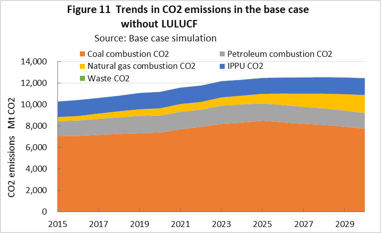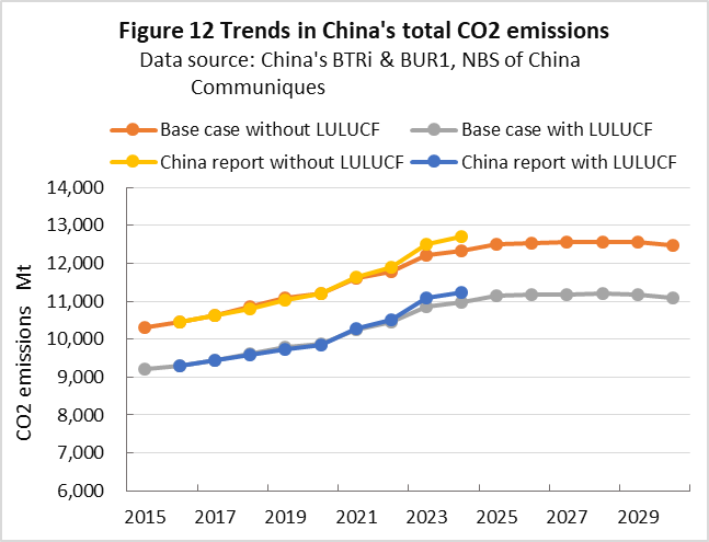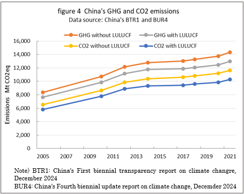| top > global warming > China CO2 China's 2030 CO2 reduction target difficult to achieve, By: Yuzo Tanaka, Japanese Researcher Published November 8, 2025 Revised January 13, 2026 ![]() Summary Unlike developed countries, China's economic growth rate of 4-5% inevitably leads to increased energy consumption. To reduce CO2 emissions, it is necessary to implement CO2 reduction measures that offset the increase in energy consumption. Effective CO2 reduction measures by 2030 include expanding the use of renewable energy and switching from coal to natural gas. The former reduces fossil fuel consumption, while the latter leads to low-carbon energy consumption. To sustainably reduce CO2 emissions while increasing energy consumption, it is necessary to continually add new CO2 reduction measures each year to offset the increase in energy consumption. Achieving a sustainable reduction in CO2 emissions while simultaneously increasing energy consumption is more difficult than you might think. Nevertheless, peaking CO2 emissions by 2030 is a goal announced by President Xi Jinping, and therefore likely to be achieved. What is challenging is achieving the target for CO2 emissions per GDP (carbon intensity). China's 2021 updated NDC (Nationally Determined Contribution to Climate Change) states that it will reduce CO2 emissions per GDP by more than 65% from 2005 levels by 2030. This goal has become more difficult to achieve due to a larger-than-expected increase in energy consumption since the updated NDC was submitted. This paper uses a simplified simulation to examine the achievement of CO2 reduction targets by 2030. The simulation assumed future GDP growth rates and total energy consumption, and calculated CO2 emissions under conditions of increased non-fossil fuel power generation and natural gas consumption. Details are provided in the main text. According to the simulation, achieving the 2030 target will require a roughly 2.7-fold increase in the total amount of electricity generated by wind and solar power, as well as natural gas consumption, in 2030 compared to 2024 levels. Wind and solar power, whose output fluctuates depending on the weather, will account for around 40% of total electricity generation. This will require significant investment in strengthening the power transmission network by 2030, and advanced grid operation will be required to ensure a stable power supply. Furthermore, China currently relies on imports for approximately 40% of its natural gas consumption, and most of the increase will be due to increased imports. This is expected to increase China's import costs and tighten the global natural gas supply and demand situation. Main targets for climate change Table 1 shows China's updated NDC, submitted in 2021, for the Paris Agreement. It aims to peak CO2 emissions by 2030 and reduce CO2 emissions per GDP by more than 65% from 2005 levels. ![]() GHG and CO2 emissions To provide an overview of China's greenhouse gas (GHG) and CO2 emissions, Figures 1 and 2 show the breakdown for 2021. This data is from China's "First Biennial Transparency Report on Climate Change (December 2024)" submitted under the Paris Agreement. GHG in Figure 1 shows the breakdown of CO2, CH4, N2O, and F-gases. Emissions are expressed as the percentage of CO2 equivalents (CO2eq), excluding emissions from the land use, land-use change, and forestry (LULUCF) sector. CO2 emissions account for 81% of GHG emissions. Emissions from the LULUCF sector were minus 1,315 MtCO2eq (removals), mostly due to CO2. ![]() Figure 2 shows a more detailed breakdown of CO2 emissions. The numbers at the beginning of the emission source names in the figure, such as 1.A.1, are numbers specified in the GHG emissions reporting standards of the United Nations Framework Convention on Climate Change (UNFCCC), with 1.A.1 to 1.A.4 representing 1.A fuel combustion emissions, and 2.A to 2.C representing 2. industrial process and product use (IPPU) emissions. CO2 from fuel combustion accounts for 87% of total CO2 emissions. ![]() Figure 3 shows the specific product processes with high emissions instead of the industrial sector for the IPPU sector shown in Figure 2. The cement process accounts for 6.9% of total CO2 emissions, followed by lime process at 1.6%, petrochemical process at 1.4%, and ammonia process at 1.2%. ![]() CO2 emitted from using fossil fuels as fuel is classified as fuel combustion CO2. On the other hand, CO2 derived from limestone, such as in the cement and lime production processes, and CO2 emitted from fossil fuels used as raw materials in plastics production, are classified as IPPU CO2. Figure 4 shows the trends in China's reported GHG and CO2 emissions, both with and without consideration of LULUCF. Note that 2005 is the base year for China's GHG emission reductions. The rate of increase in emissions from 2005 to 2021 is approximately 1.7 times for GHGs and approximately 1.8 times for CO2, regardless of whether LULUCF is implemented. ![]() Figure 4 shows that emissions growth was slow in the mid-2010s. This is due to restrictions on coal use, particularly in small and medium-sized facilities, which were implemented as a measure to combat serious air pollution caused by coal use, thereby curbing the increase in CO2 emissions. Energy consumption data China's CO2 emissions are increasing due to increased energy consumption resulting from economic growth. Figure 5 shows the total energy consumption data reported by the National Bureau of Statistics (NBS) of China. This article uses data reported by Chinese official institutions whenever possible. ![]() China's total energy consumption is equivalent to the International Energy Agency's (IEA) total energy supply (TES). China's total energy consumption is broken down into four categories: coal, petroleum, natural gas, and primary electricity and other energy. The energy unit generally used is the standard ton of coal equivalent (tce), which is converted at 1 tce = 7 Gcal. Note t