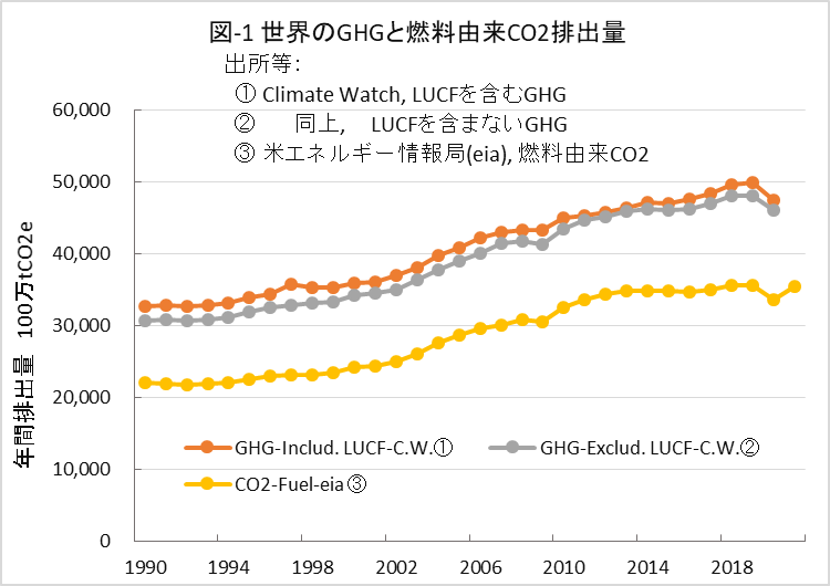 しかし、図-1からは世界のGHG排出量の顕著な減少の兆しは見られません。2009年の僅かな減少はリーマン・ショック、2020年は新型コロナによる経済活動の低下によるものです。CO2データからは、2021年には排出量が戻っていることが分かります。