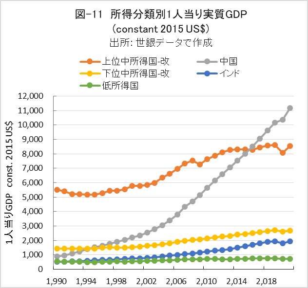 インドは、2023年に人口で中国を抜き世界最大となりましたが、図-10の1人当りGDPからは、大国インドの貧しさが分かります。1990年頃までインドは中国と同等の貧しさでしたが、今や大きな差が付いてしまいました。この数年、インドはやっと豊かさへの入口に立つことができたのだと思います。