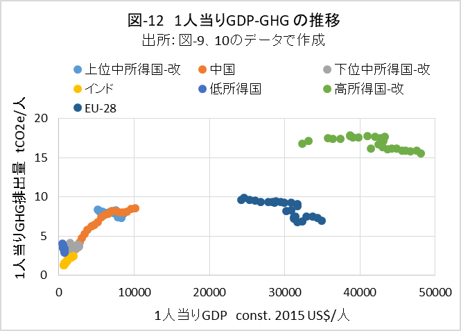 図-12に、1人当りGDPを横軸に、1人当りGHG排出量を縦軸としたグラフを示しました。図-9と図-10の1995年以降のデータを分散図で示したものです。これまでのトレンドは、GDPが増加し豊かになると、GHG排出量が増加することを示しています。なお、EU-28はGHG排出削減に注力しているため、他のグループよりGHG排出量が低減しています。