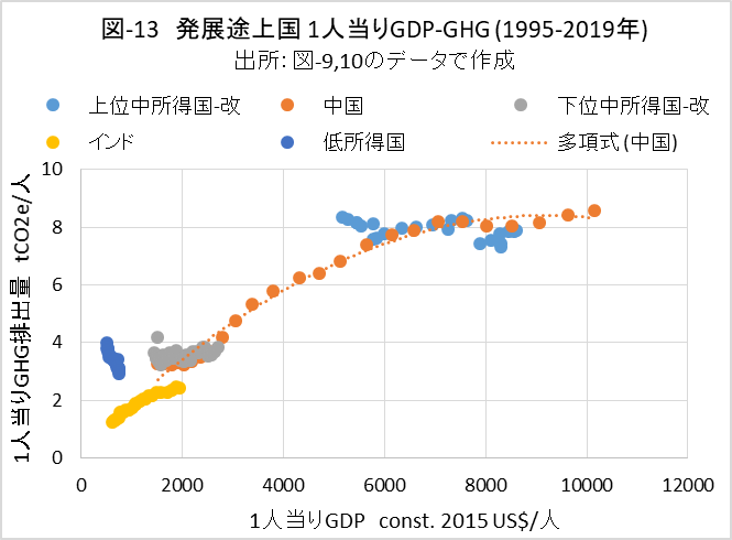 図-13は、発展途上国だけを示したもので、中国のデータの近似曲線を併記しました。これまでのトレンドに従うなら、発展途上国が今後も経済成長を続けると、概ねこのようにGHG排出量が増加すると考えられます。