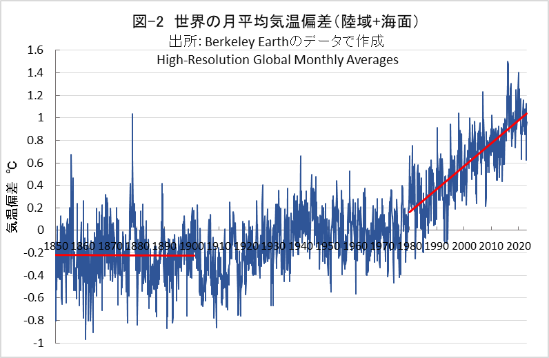 図-2は、米国Berkeley Earth(www.berkeleyearth.org)が公表している世界の月次平均気温データ(陸域+海洋)をグラフ化し、1850~1900年と1980~2022年の両区間の線形近似を赤色直線で併記したものです。
