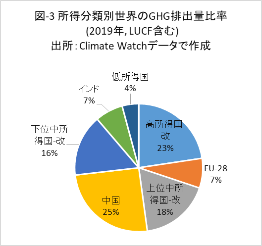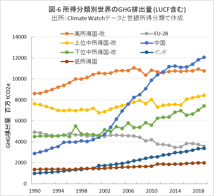 本稿では、GHG排出量の増減やグループ間の多寡を問題としており、データ絶対値の不確かさが論旨に及ぼす影響はそれほど大きくないと考えています。図-6で注目されるのは、中国のGHG排出量の急増ですが、GDP経済成長率と併せて後述します。