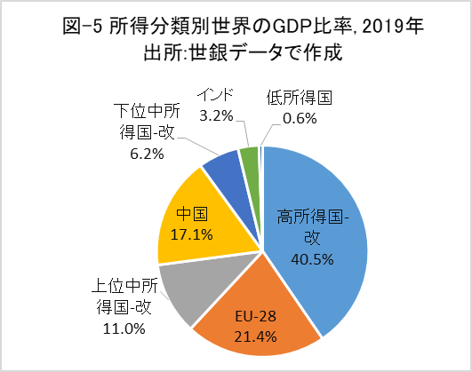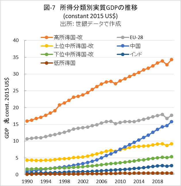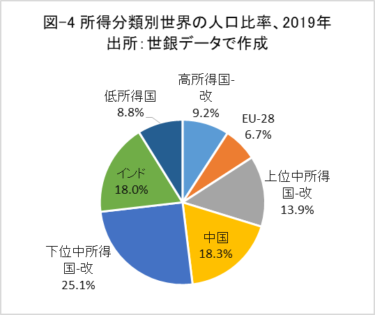 英国を含めたEU-28はブルガリアを除いて高所得国に分類されています。中国とインドは、それぞれ上位中所得国と下位中所得国に分類されています。本稿では、各々それらを除いた所得分類グループを「‐改」を付けて示しました。