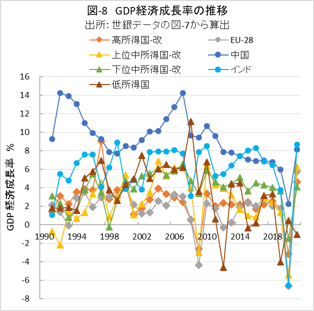 図-7に各グルーブのGDPの推移、図-8にはGDP推移から計算したGDP経済成長率を示しました。分かりづらいかもしれませんが、先進国に比べ発展途上国の経済成長率が高い値です。