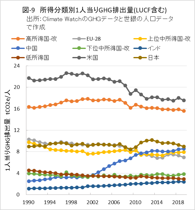 1人当りGHG排出量も各グループで大きく異なります。近年の値で、高所得国-改は16 tCO2e/人前後と多く、EU-28、上位中所得国-改、中国はその約半分です。また、低位中所得国-改、インド、低所得国は、更にその半分以下のGHG排出量です。