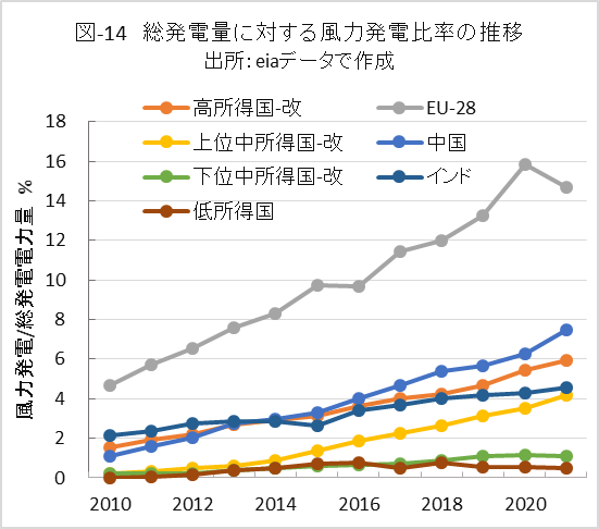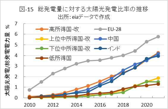天候により発電出力が変動する風力発電や太陽光発電(Variable Renewable Energy, 略VRE)は、電力需要の増加に応えるためでなく、GHG排出削減だけのために導入されてきました。そのためVREの導入は、GHG削減に熱心なEU-28が一番多く、GHG排出大国の中国やインド、そして経済余力のある高所得国が続いています。