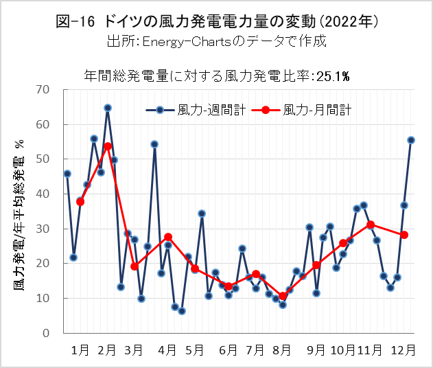 図-16は、2022年ドイツ全体の陸上と洋上合計の風力発電の発電電力量の変動を示したものです。週間計は、年間総発電電力量の平均の1週間分を100%とし、各週の風力発電電力量の割合を示したもので、月間計も同様です。ドイツ全体で地域的に平準化された変動であることに留意して下さい。