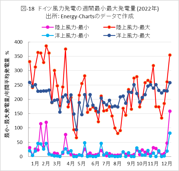 図-18には、ドイツの陸上と洋上風力の各々について、週間の最小と最大発電量を示しました。縦軸は前図と異なり、各風力発電の年間平均発電量との比率であることに注意して下さい。