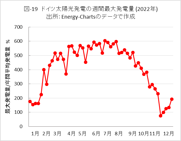 図-19は、同様にドイツ全体の太陽光発電の週間最大の発電量を示したものです。最小値は表示していませんが当然ゼロです。週間最大値は、年間平均値の1倍以下から6倍以上の範囲で変動しています。