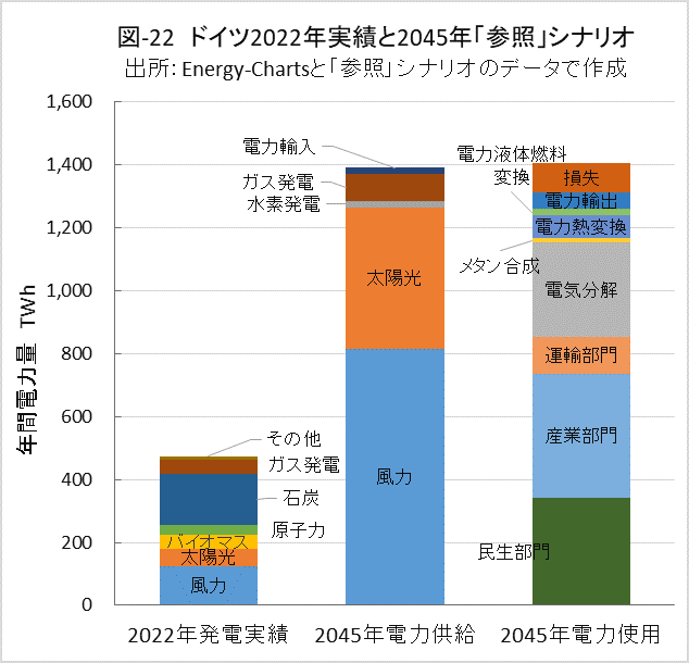 図-22に、前記2022年実績の電源構成と対比して、「参照」シナリオの2045年の電力供給と電力使用の内訳を示しました。