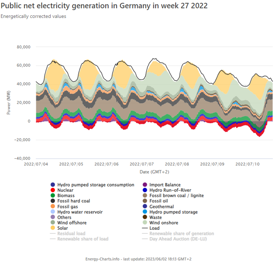 下図はEnergy-Chartsから転載したサンプルで、2022年第27週(7月4日~10日)の発電量の推移です。タイトルに公共正味発電とあるのは、自家発を含まない、電力系統に投入された値の意味です。