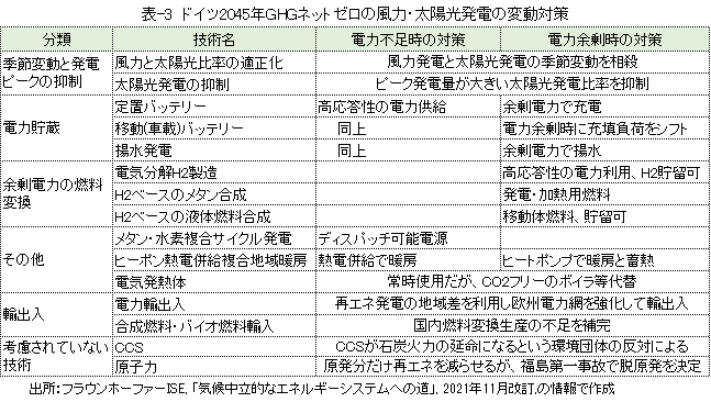 2045年「参照」シナリオの電力使用量の想定で、民生部門、産業部門および運輸部門の通常の電力使用は全体の約6割で、残り約4割は発電変動対策に関連した電力使用です。表-3に、上記レポートに記載されている発電変動対策を示しました。