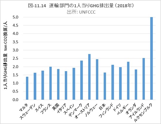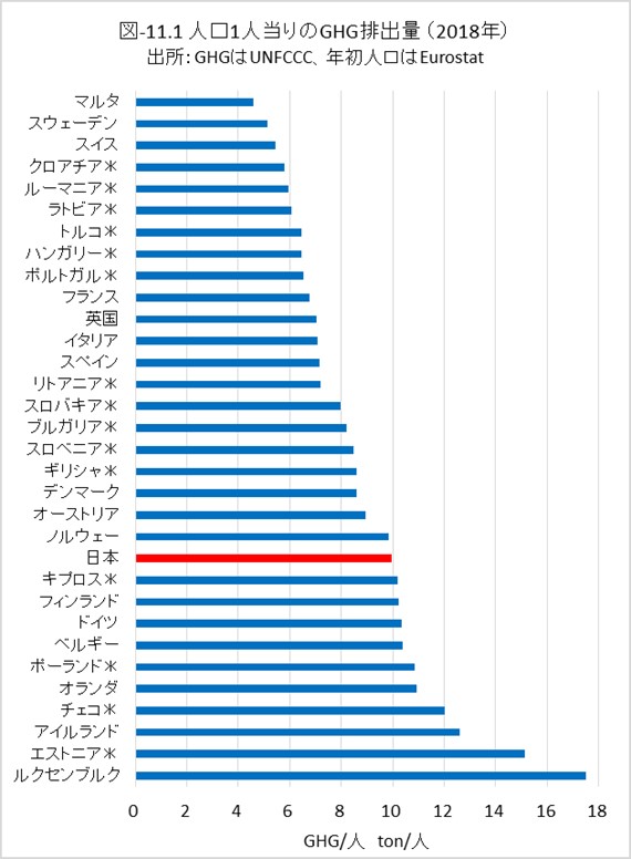 図-11.1に、EU-27に英国、ノルウェー、スイス、トルコと比較対象の日本を加え、2018年の人口1人当りのGHG排出量を示しました。森林のCO2吸収量等を考慮していないwithout LULUCFの値です。