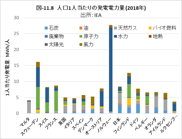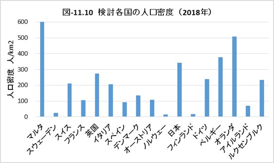 図-11.10に各国の人口密度を示しました。スカンジナビア三国は、人口密度が格段に低いことが分かります。ノルウェーやフィンランドは、現状の人口1人当りのGHG排出量はそれほど少なくありませんが、スウェーデンと同様の理由で、比較的容易にGHG実質ゼロを達成できる可能性があります。