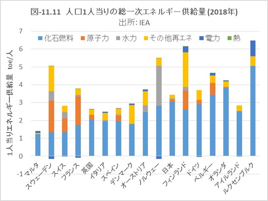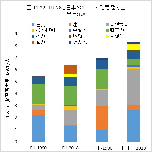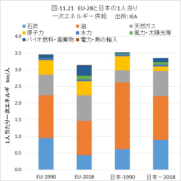 図-11.21は英国を加えたEU-28と日本について、人口1人当りの一次エネルギー供給量のエネルギー内訳、図-11.22は発電電力量の電源内訳を1990年と2018年で比較しました。
