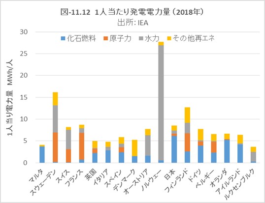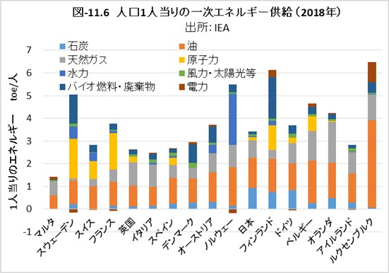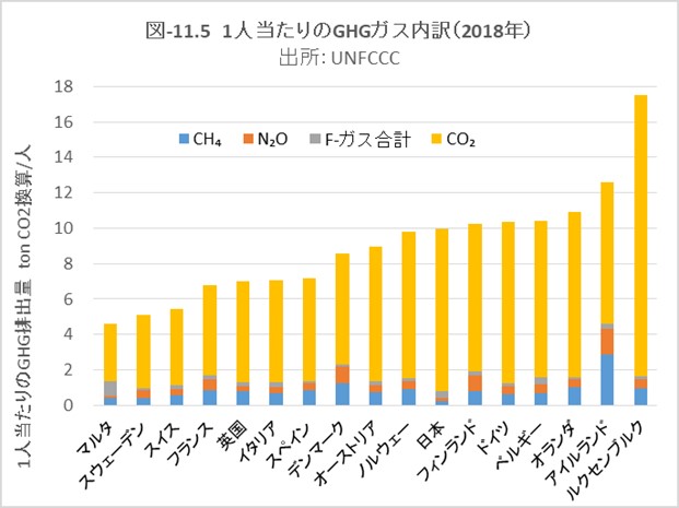 EUの検討諸国と比べ、ドイツと日本は1人当りのGHG排出量が多い部類ですが、上記の図-11.4でエネルギー転換部門と製造業等の部門のGHGが多いことが要因です。