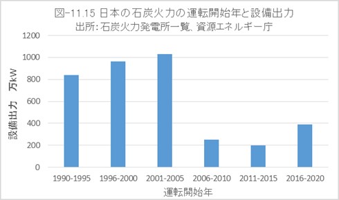 日本は京都議定書でGHG6%削減の義務を負いましたが、2015年のパリ協定の採択頃まで、GHG実質ゼロが必要になる事態を真剣に考えていなかったものと思います。筆者もそう考えていました。そのため、石炭火力の新設は規制されませんでした。図-11.15に、1990年以後に日本で運転開始した石炭火力の発電容量を示しました。