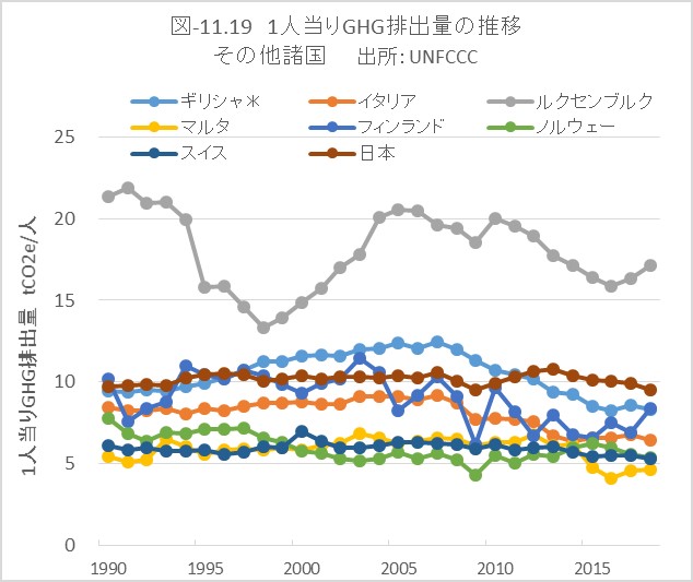 図-11.18は、1990年台前半にGHG排出量が急速に低減したが、その後顕著な低減が見られない国です。何れも東欧諸国で、旧ソ連圏の時代に省エネが遅れていた国々です。京都議定書によるGHG削減で、最初はGHG排出低減が急速に進みました。概して1人当りのGDPが低い国で、政策の重点が豊かさに置かれたためと思われ、その後は排出低減が進まなかった国です。