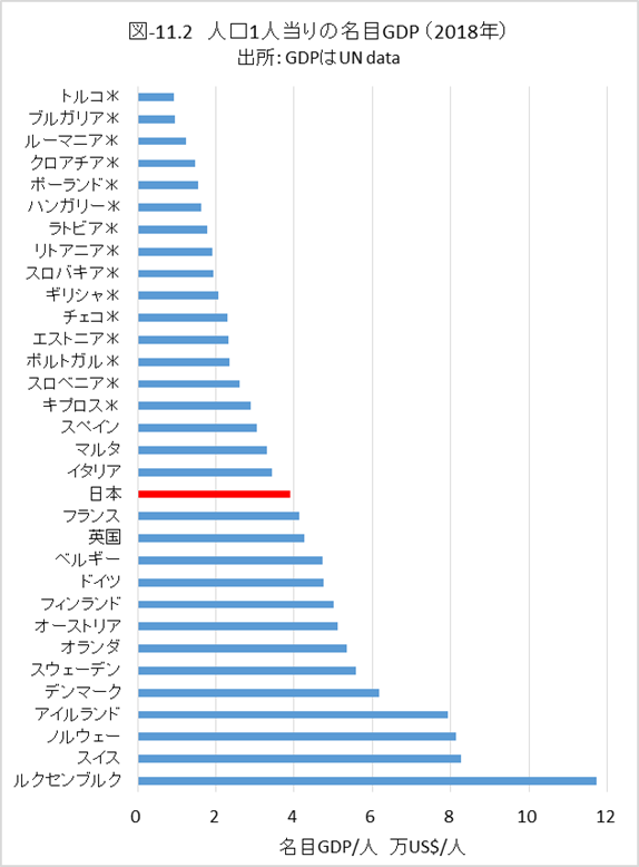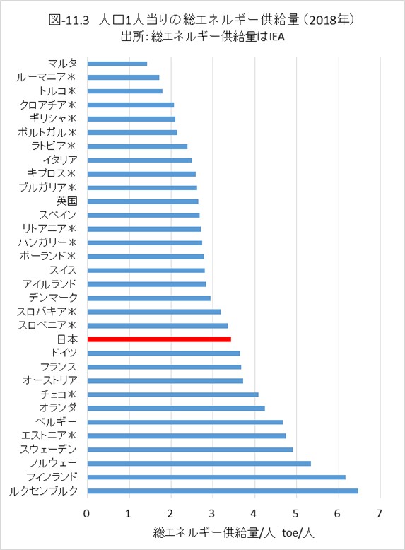 経済水準が低く、1人当りのエネルギー消費が低いために、CO2排出量が少ない国があります。図-11.2には人口1人当りの2018年の名目GDP、図-11.3には、1人当りの総一次エネルギー供給量(TES)を示しました。国名の後ろに*印を付けた国は、1人当りのGDPが3万USドル以下の国であり、それらの国を除いて、GHG排出量を紹介することにします。