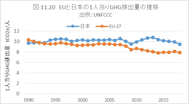 図-11.20は 、EU-27ヵ国と日本の人口1人当りのGHG排出量(with LULUCF)の1990年から2018年までの推移です。GHGの排出低減で、日本はEUに少し遅れていますが、GHG実質ゼロを達成するには、両者とも長い道のりが残っています。GHGの排出低減は、排出量が少なくなるほど困難さは増大します。