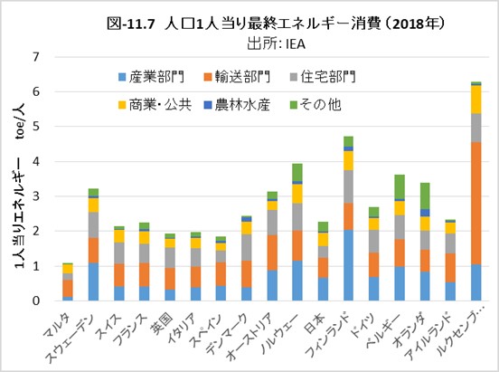 図-11.6はエネルギー種類の内訳、図-11.7は消費部門の内訳が示されています。エネルギー起源のGHG排出量を論じるには、各国のエネルギー消費量と、使用エネルギーの脱炭素化について知ることが必要です。寒冷地の国は、概して住宅のエネルギー消費が多くなります。また、鉄鋼などのエネルギー多消費費産業が多い国は、産業部門のエネルギー消費が多くなります。