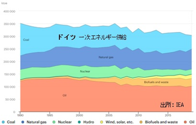 前者は、使用エネルギーの脱炭素化が進んでいないことが影響しています。下記に、1990年から2018年までの日本とドイツのTESの推移を示しました。日本の石炭消費については上記しましたが、ドイツは石炭使用量は減少しましたが、かなり残っています。ドイツの石炭火力は、主に国内で産出し他の用途が少ない低質の褐炭を使用しています。石炭火力の廃止計画が出されていますが、設備寿命が残っているものの廃止は計画通りに進まないようです。