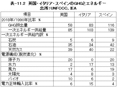 標記3国は、図-11.4に示したように2018年の人口1人当たりのGHG排出量がほぼ同じ値です。英国とイタリアは人口も国土面積も似通っており、スペインは国土面積は倍近くで人口は7割くらいの国です。