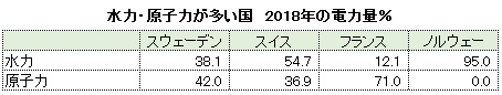 水力発電や原発比率が高い国は、GHG実質ゼロ達成に近い国です。発電コストが高く変動が大きい太陽光発電や風力発電への依存が少なくて済むためです。それらの国を下表に示しました。