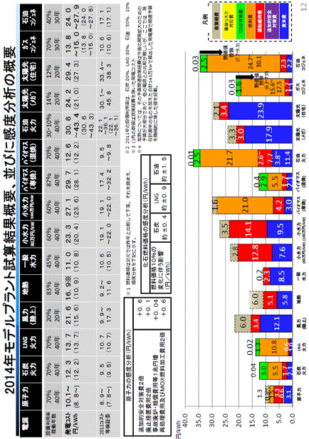 日本の発電コストの情報としては、発電コスト検証WGの報告が広く認められ、良く整理された情報と思います。東日本大震災後の2011年に出された報告を、2015年に安全対策費等見直し、発電コストがアップした報告が出されています。2014年と2030年モデルプラントの試算結果が報告されていますが、現状のコストとして、下記に2014年モデルプラントの資料を示しました。