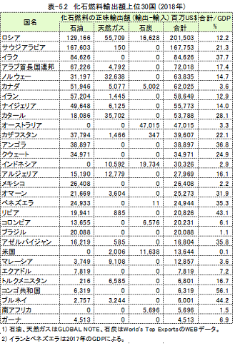 表-5.2に化石燃料の輸出額が大きい30か国を示しました。名目USドルによるデータです。輸出と輸入がある国は、輸入額を差し引き正味輸出額として示しました。石油、天然ガス、石炭の合計輸出額とGDPの比率を併記しています。