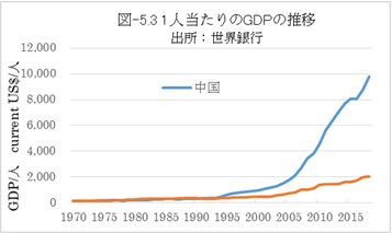 表-5.3には、日本や米国との比較を示しました。一人当たりのGDPでインドの約5倍の中国も、日米と比べると、2014年実績で日本の約1/5、米国の約1/7です。