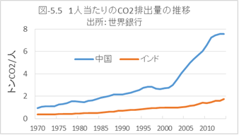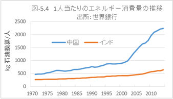 図-5.4、図-5.5に、中国とインドの一人当たりのエネルギー消費量とCO2排出量の推移を示しました。中国はエネルギー消費を拡大させ、CO2排出量を増加させたことで、経済成長を遂げたことが理解できるでしょう。