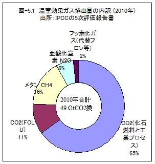 図-5.1は、IPCC の5次評価報告書に記載されている2010年のGHG排出量を示したものです。非CO2を含めた世界全体のGHGについて、統計的に積み上げたデータはないでしょうから推定値です。