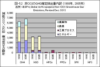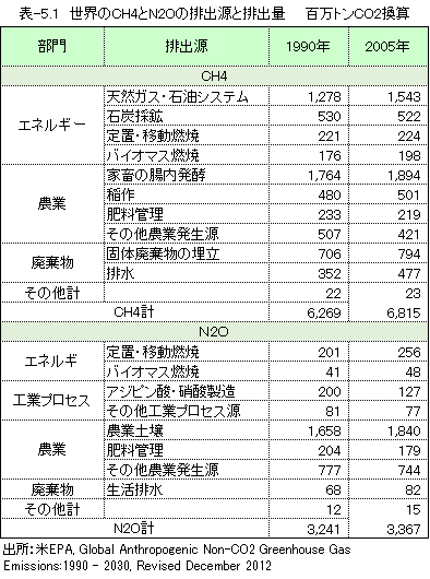 図-5.2には、1990年と2005年の排出量で、排出源の情報を含めデータを示しました。同データは、IPCCのデータをもとに、米国環境省(EPA)が推定したもののようです。1990年から2010年まで、微増したと推定されていますが、正確なデータなど入手できないでしょうから誤差範囲と言えるでしょう。