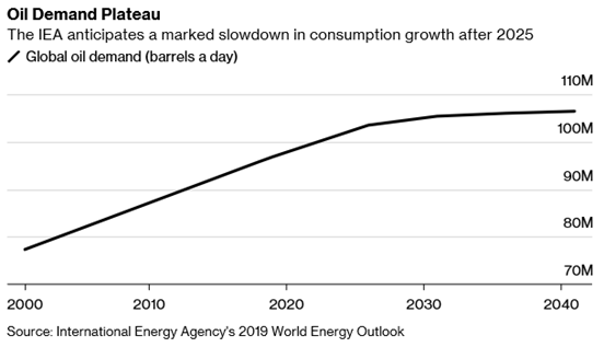 世界エネルギー機関(IEA)は、2019年11月に発表した世界の石油需要見通しで、下図のように、石油需要は2030年以降横ばいになり、2040年まで需要減少は訪れないと予測しています。