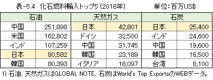 表-5.4に、2018年の化石燃料国別輸入額ベスト5を示しました。日本は天然ガスと石炭の輸入額で世界一です。石油は中国、米国、インドに次いで第4位です。中国やインドは、人口が日本の10倍ですから、比較の対象になりません。