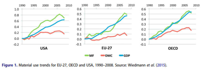 1. のように、米国、英国、日本、OECD、EU-27は、DMC(化石燃料を含む)とGDPの相対的な分離を達成した一方で、マテリアルフットプリントMFはGDP以上の速度で増加していることを示しています。