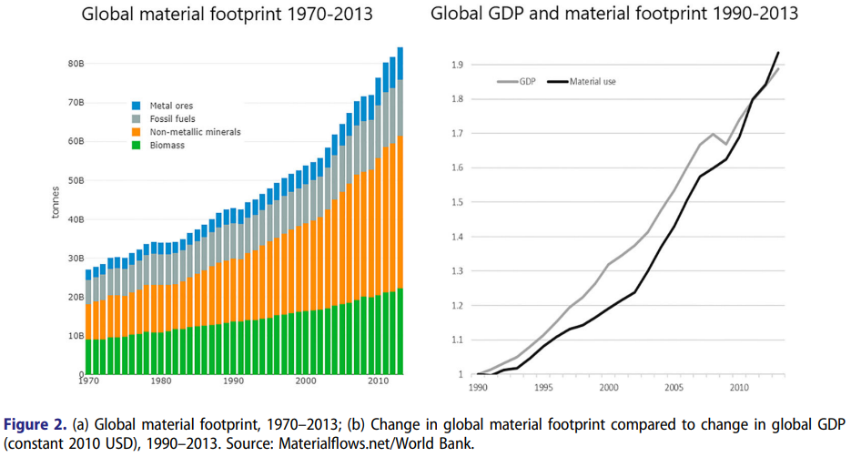 世界規模では、Figure 2. (a) に示されるように、資源の使用は着実に増加しています。GDPと資源利用の関係は、Figure 2. (b)