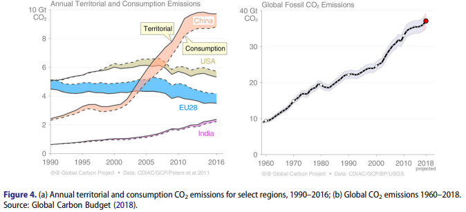 Figure 4. (a)には、2006年から2016年までの米国とEU28のCO2排出量の減少を、Teritorialベース(CO2の発生場所べースの集計)とConsumptionベース(輸入品の生産・輸送過程のCO2排出を考慮)の両面で示しています。多くの高所得国では経済成長が続いているにもかかわらず、21世紀にCO2排出量が減少しています。一方、中国の排出量は2014年から2016年の間にわずかに減少し、2017年に再び増加しました。発展途上国は、GDP成長よりも遅い速度ですがCO2排出量は増加を続けています。