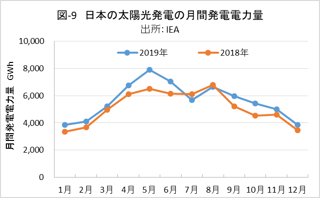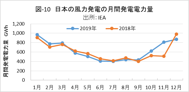 確実に生じる発電変動として、太陽光発電や風力発電の季節変動があります。図-9、図-10は、2018年、2019年の日本の太陽光発電と風力発電の月間発電量の実績です。年初に比べ年末の発電容量には10%弱の増加があると思われ、その分を差し引いて考える必要があります。太陽光発電では5月から8月の発電量が多く、12月、1月の2倍近くです。一方、風力発電では、12月、1月の発電量が多く、夏季の2倍以上です。