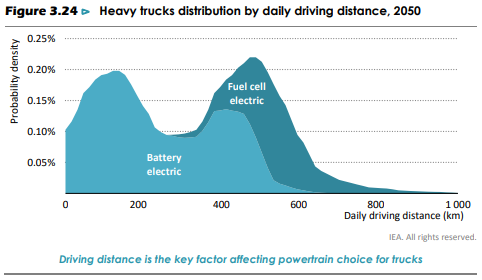 長距離を走行する大型トラックの場合、現在、バイオ燃料がディーゼル燃料に代わる主な代替手段であり、2020年代に大型トラックからCO2排出を削減する役割を果たします。2030年以降、IEA-NZEの想定では、サポートインフラが構築され、コストが低下するにつれ(バッテリーのコスト低減とエネルギー密度向上、水素の生産と配送コストの低減)、電気および水素を動力源とする大型トラックの数が増加します。