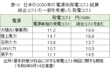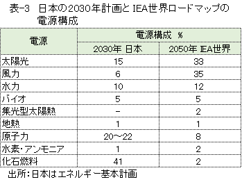 表-3に、2030年の日本のエネルギー基本計画の電源構成と、2050年のIEAによる世界ロードマップの電源構成を示しました。日本の46%削減の達成は大変なことですが、実質ゼロを達成するには、更に太陽光発電や風力発電を大幅に増やし、化石燃料火力をほとんど無くすことが必要です。そのような電源構成の下で、安定に電力を供給する統合コストは、2030年の試算より大幅に増大すると思われます。