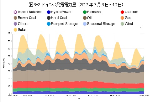 下図は2017年7月3日から1週間のドイツの発電量のグラフです。ドイツの研究機関Fraunhoferの太陽光部門のウェブサイトEnergy Chartsに掲載されているものです。