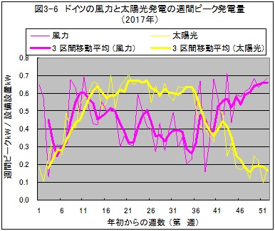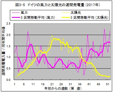 下図は同じドイツのデータに基づくもので、週間発電電力量をその年間平均値で無次元化したものです。横軸は、年初から第何週目かを示しています。週ごとのデータは変動が大きく、傾向を掴みずらいため、3区間の移動平均値を太線で併記しました。