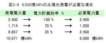 電力貯蔵による損失があるため、電力貯蔵した上で消費する電力は余分に発電しなければなりません。下記例では、6,000億kWhの1.8倍の発電が必要になることを示しています。